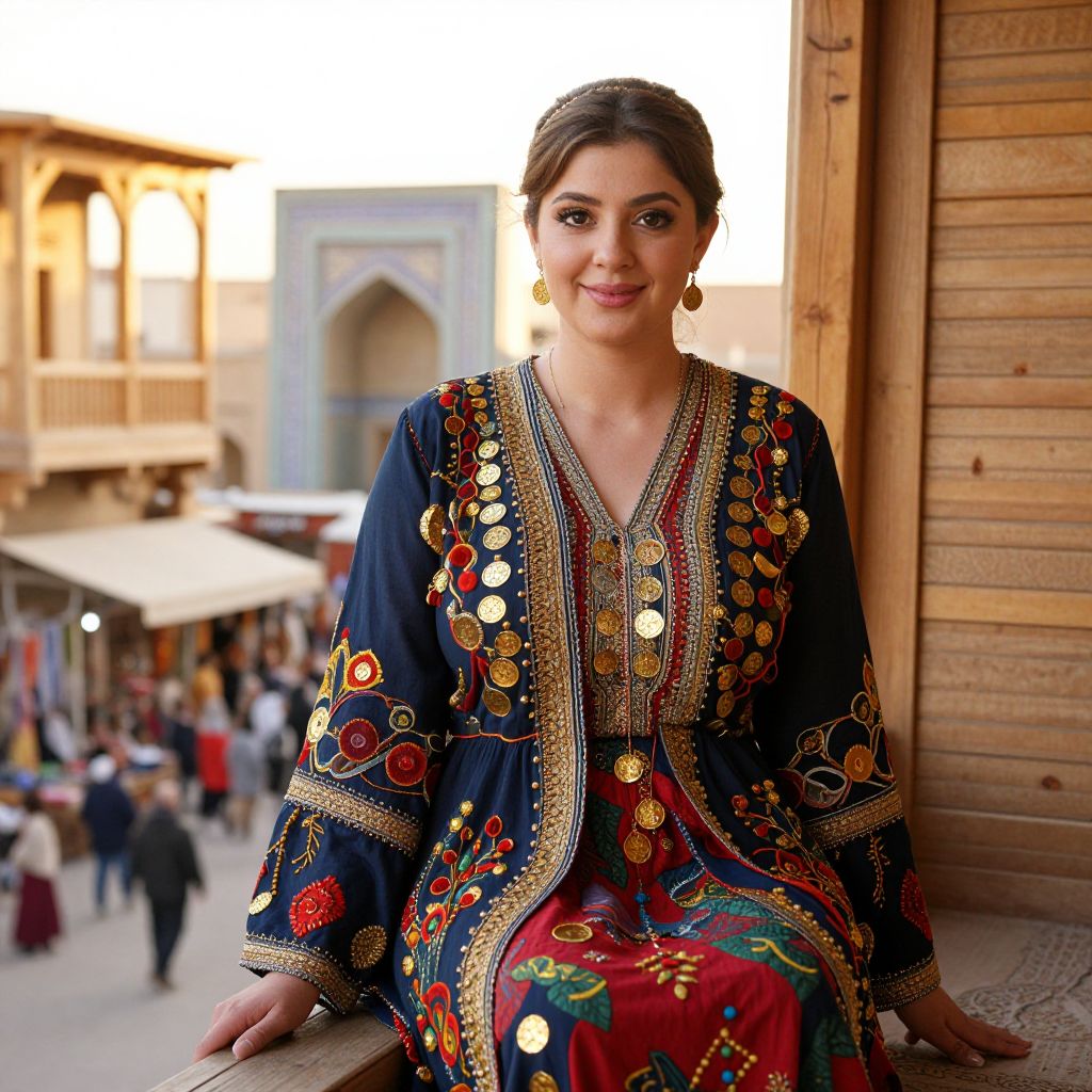 An elegant Afghan woman in her 30s with fair skin, a gentle smile, and expressive dark eyes wearing a vibrant embroidered dress made of heavy cotton and adorned with small coin-shaped embroidery in gold and red thread, sitting on a wooden balcony overlooking a traditional market in Herat, golden hour lighting, authentic cultural detail. The woman has big tits and cute face