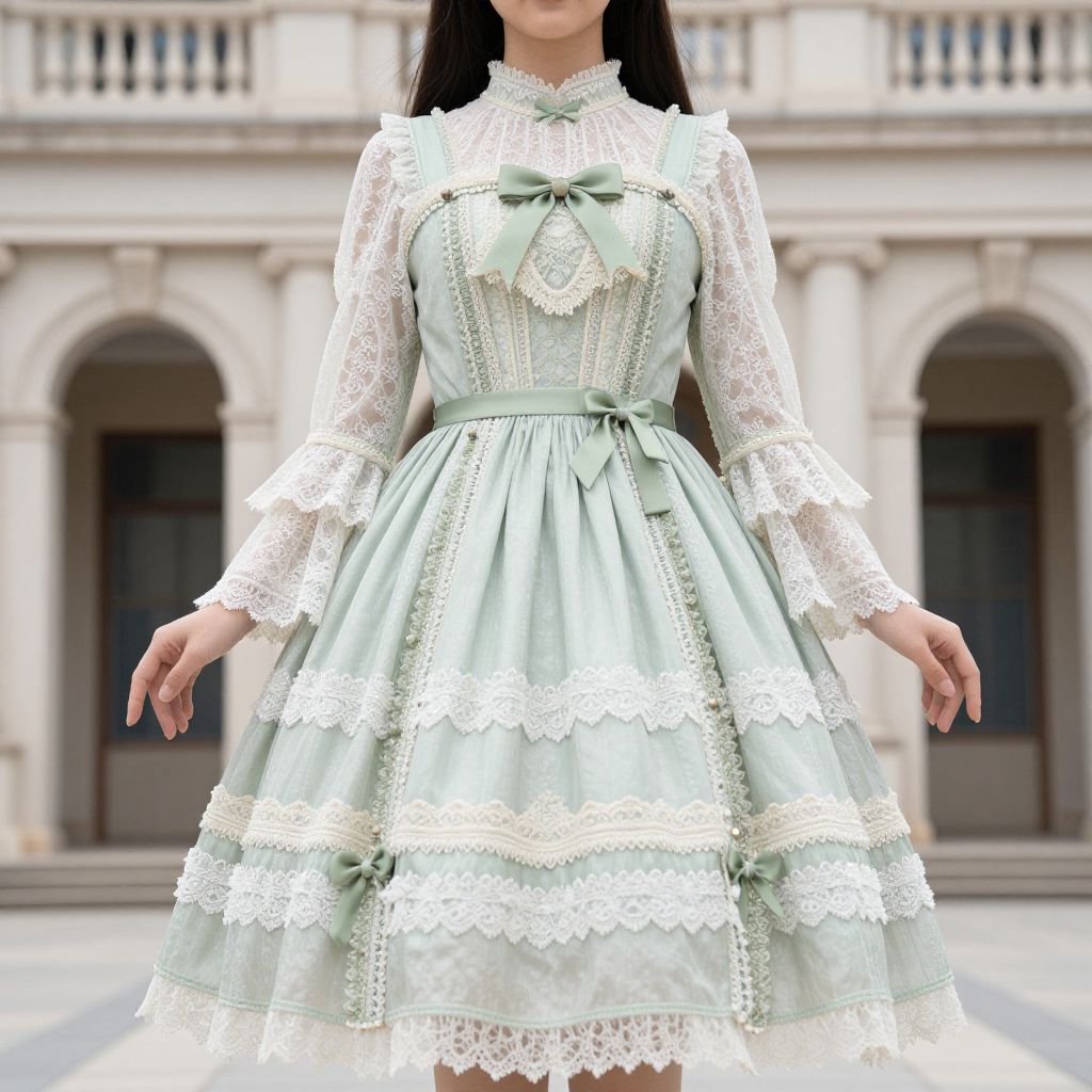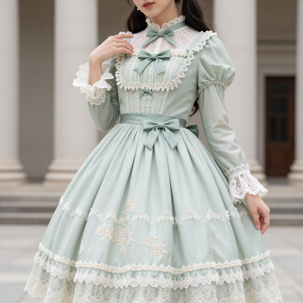 A woman elegantly adorned in a Sweet Princess Lolita-style dress featuring atrovirens green hues, long sleeves, and intricate lace detailing, exudes timeless elegance against a backdrop of classical architecture, captured in high-definition detail with a soft, natural lighting effect.
