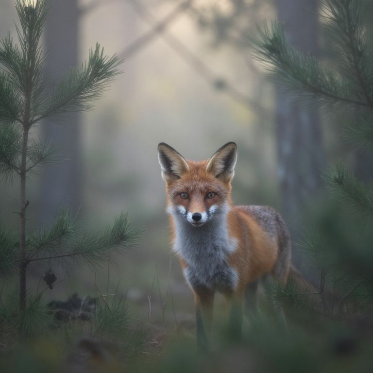 Photograph of a red fox with piercing eyes, standing alert in a misty forest, framed by pine branches, with soft light filtering through the trees
