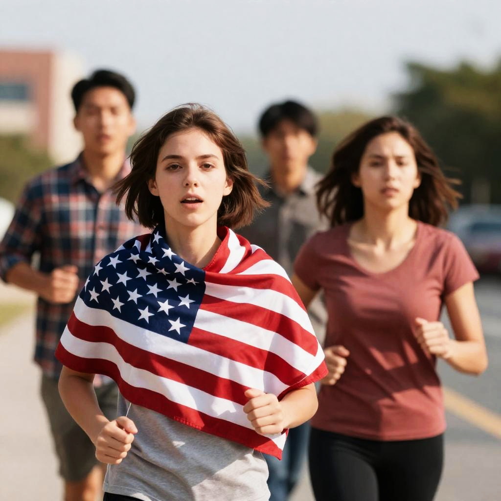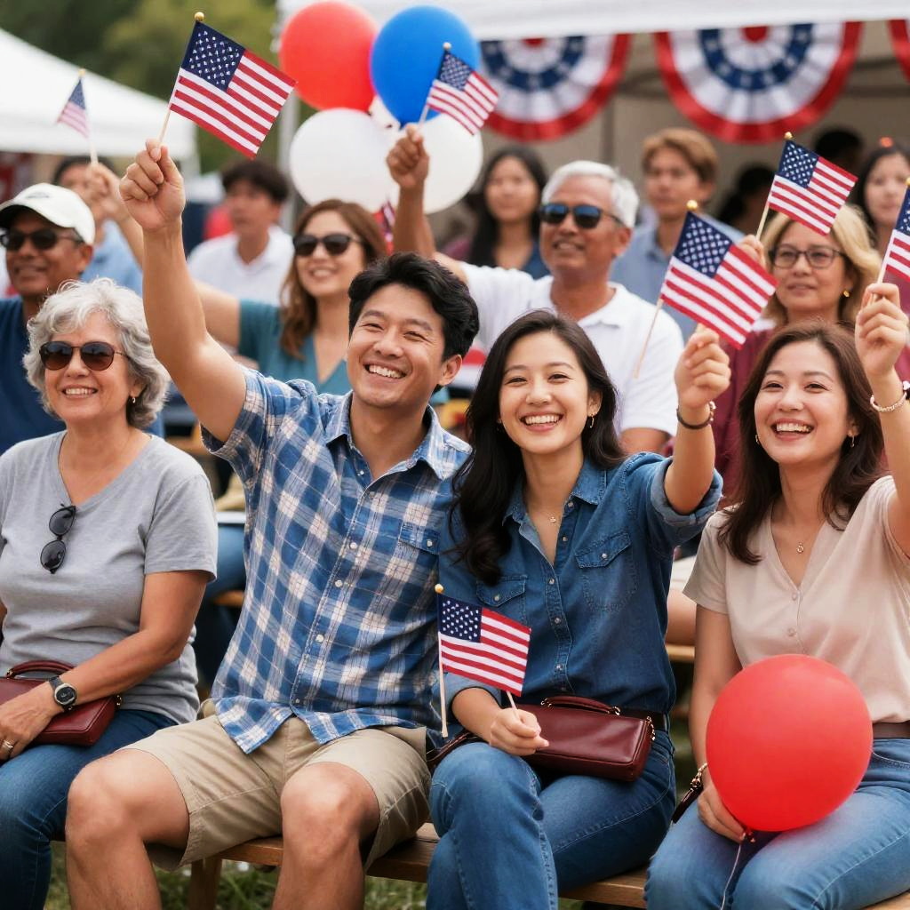 Crowd of people at an outdoor event, smiling and waving small American flags. Central couple with man in blue plaid shirt and woman in denim shirt. Seated woman in beige shirt and red balloon. Balloons and patriotic decorations in background. Bright sunlight. Mixed ages, casual clothing. 15 people. Happy, enthusiastic expressions.