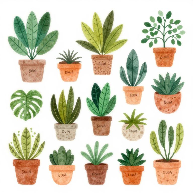 Leathery An illustration of a diverse mix of colorful, indoor plants in various shapes and sizes, each labeled with a simple, hand-drawn name tag, highlighting their unique features.,