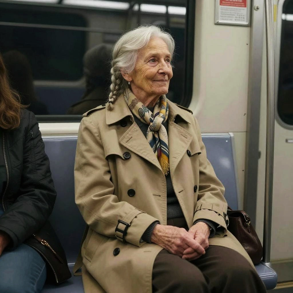 Elderly woman with silver braid and freckles sitting in a subway car, wearing a wool trench coat, patterned scarf, and leather loafers, with cool fluorescent lighting with soft window reflections and a wistful smile
