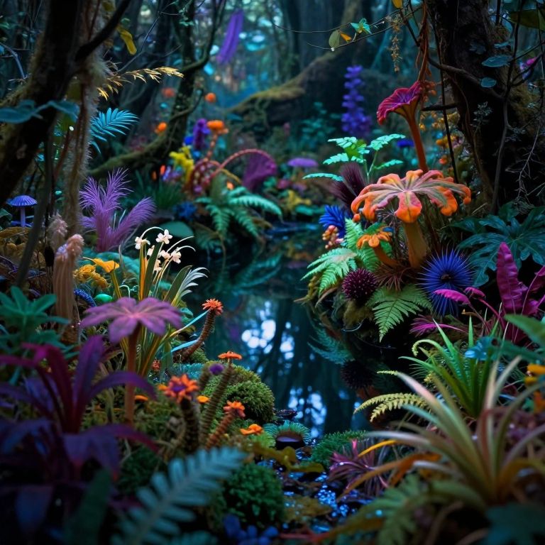An ethereal jungle panorama unfolds, teeming with vibrant flora and fauna. Observed from an up-close vantage point, the intricate details of this surreal realm are revealed in a dreamlike manner, reminiscent of viewing it through a magnifying glass or microscope lens. The gnarled tree trunks and contorted branches form abstract forms that distort time and space, inciting intrigue and amazement. A gentle haze drifts through the air, enveloping the scene in an enigmatic ambiance that beckons viewers to explore their own imagination and uncover the mesmerizing allure hidden within this fusion of styles.