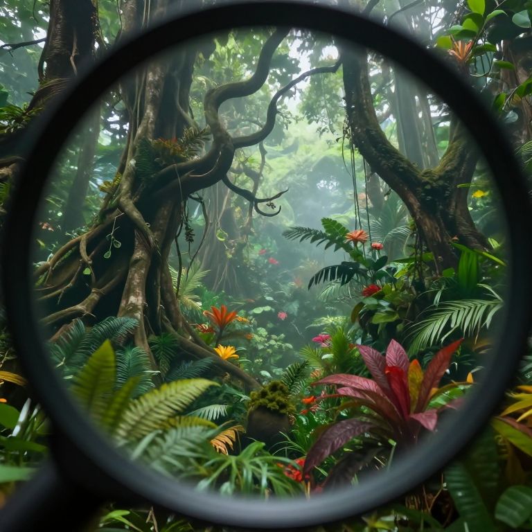 Photograph of a lush, dense jungle viewed through a circular magnifying glass. Vibrant green foliage, twisted trees, and colorful red and yellow plants