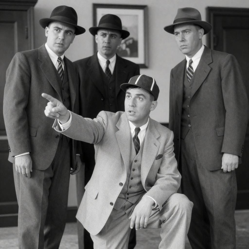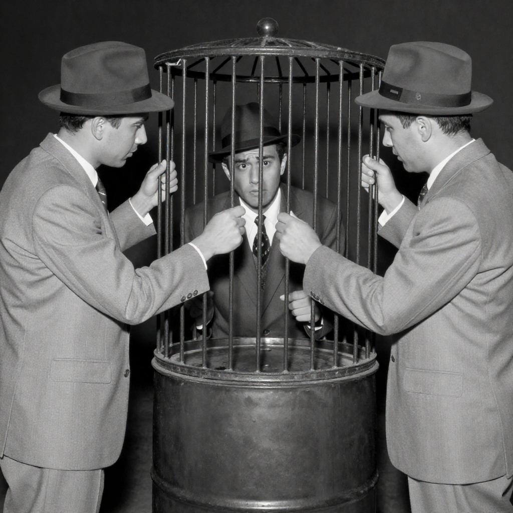 Black-and-white photograph of two men in suits and fedoras, one unlocking a metal cage holding the other, who looks worried. Barrel in background, dimly lit setting. Men wear light-colored suits, dark hats. Cage in center, men on either side.
