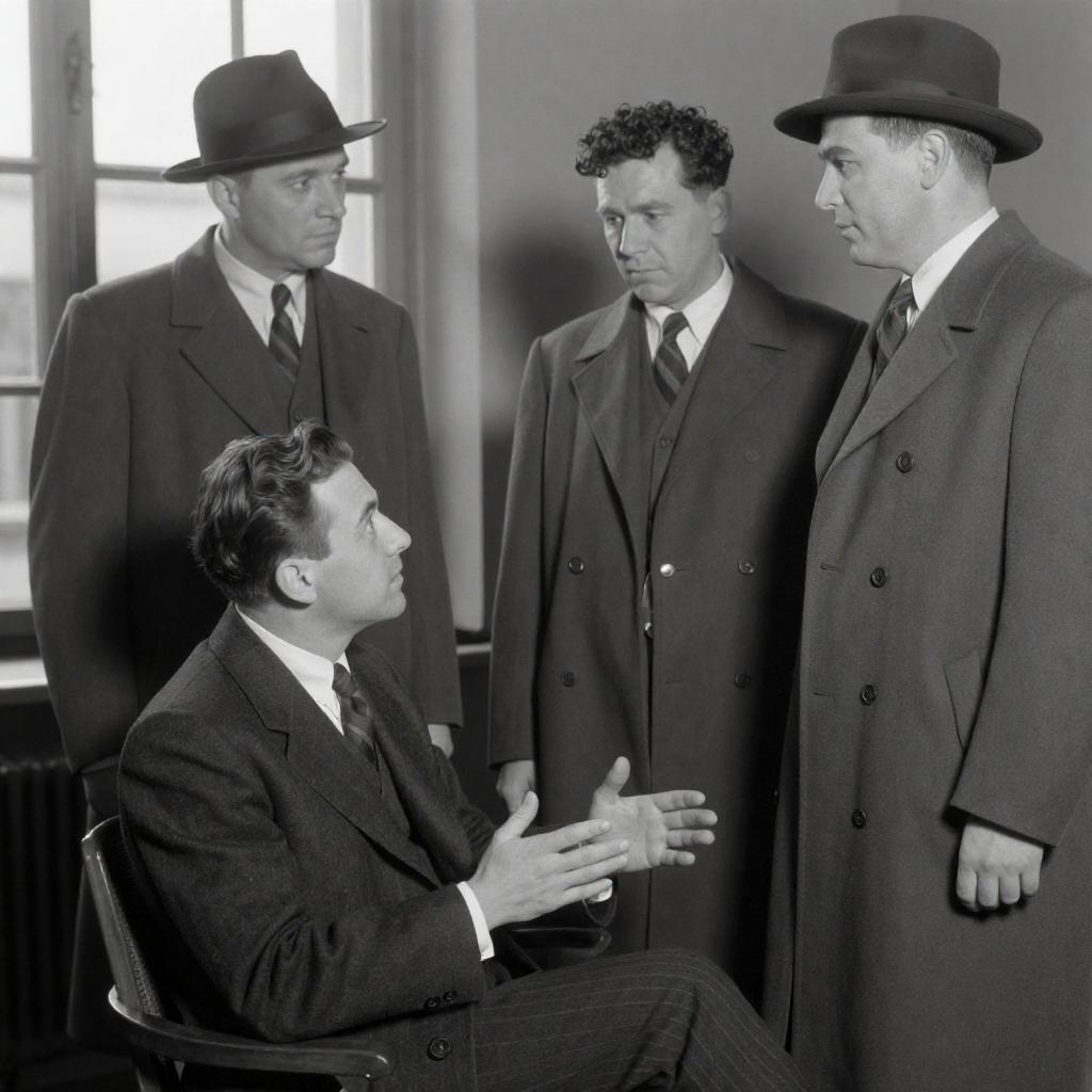 Black-and-white photograph showing three men dressed in 1940s style light-colored suits, white shirts, patterned ties, and dark fedoras. Two men stand on either side of a metal cage shaped like a barrel, holding the bars and unlocking the cage while a third man looks worried inside the cage. The image has a dimly lit background, conveying a dramatic or mysterious mood.