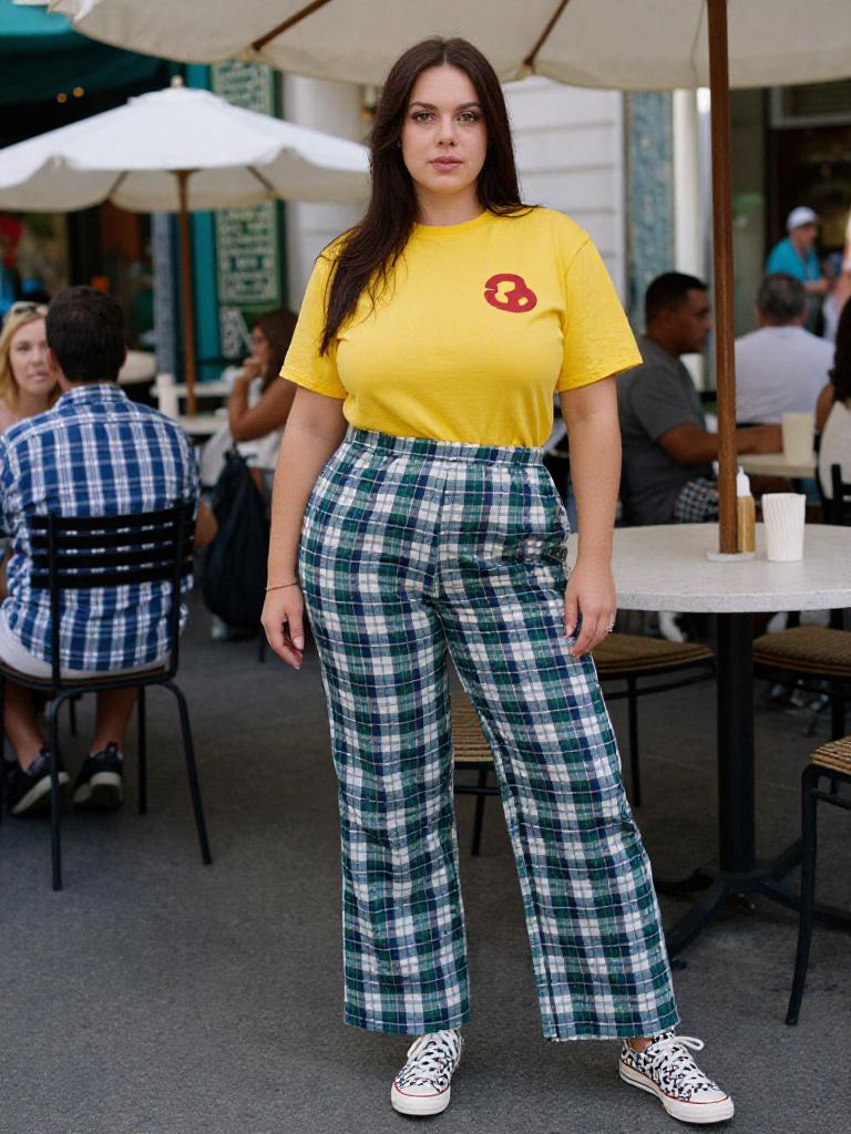 A Curvy woman in casual streetwear, wearing a bright yellow t-shirt with a red logo and wide-leg plaid trousers in blue, green, and white, paired with low-top lace-up sneakers featuring a checkerboard pattern, straight brunette hair flowing as she stands in a vibrant Town Plaza Outdoor Cafe, captured in a kodacolor analog film style. Sexy. Pretty face and beаutiful eyes. Big breasts