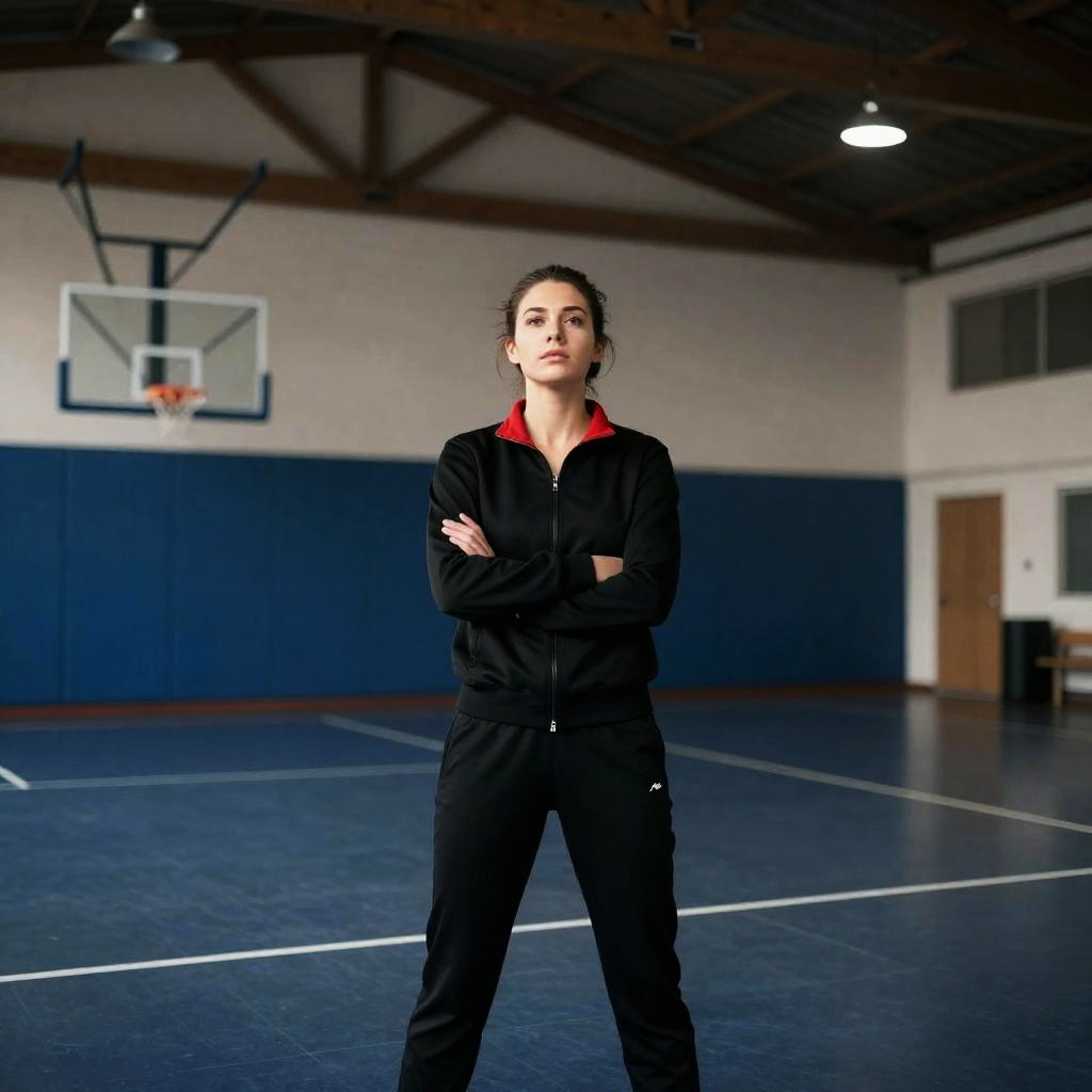 Woman in black tracksuit with red collar, arms crossed, standing in empty gym. Hair in bun, looking up. Gym has wooden beams, blue padding, basketball hoop, and industrial lighting. Soft light. Background slightly blurred. Single person.