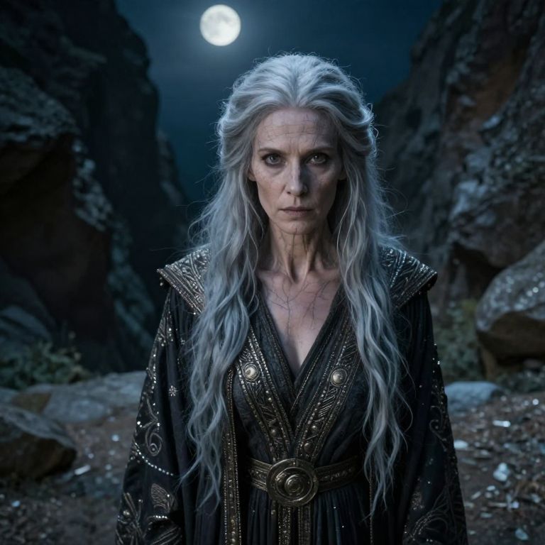 In a hyper-realistic portrait, an enigmatic fortune teller stands above a moonlit ravine, cloaked in intricate embroidery and shimmering metallic threads. With long silver hair cascading down her back, she gazes intensely into the distance, as if peering through time itself. Captured from an unconventional aerial perspective, soft, diffused light enhances the celestial atmosphere, subtly illuminating her skin to reveal fine lines and ageless wisdom etched upon her face. Delicate veins are visible beneath translucent skin, adding to the mysterious allure of this ancient mystic navigating through time and space. This captivating image evokes a profound emotional connection between observer and subject.