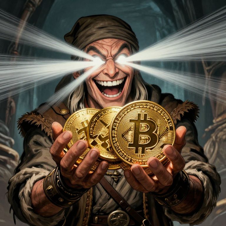 Stenciling Ancient rogue peddler laughing himself silly with a large amount of Bitcoin in his hands, Beam rays are coming out of his eyes, bitcoin::6,