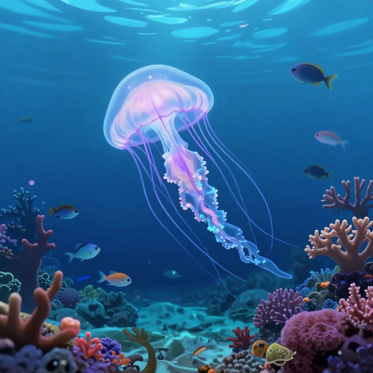 Craft an enchanting digital art scene reminiscent of anime, depicting a captivating underwater world from a 'bug's-eye view'. The focal point is a translucent jellyfish gracefully drifting among colorful coral reefs, with ethereal blue and purple light radiating from its undulating tentacles. Delicate sea creatures of various forms create a moving tapestry, transitioning from peaceful serenity to bewitching fascination as they engage within the captivating aquatic realm, all set against a deep, rich blue ocean floor that fades into the horizon.
