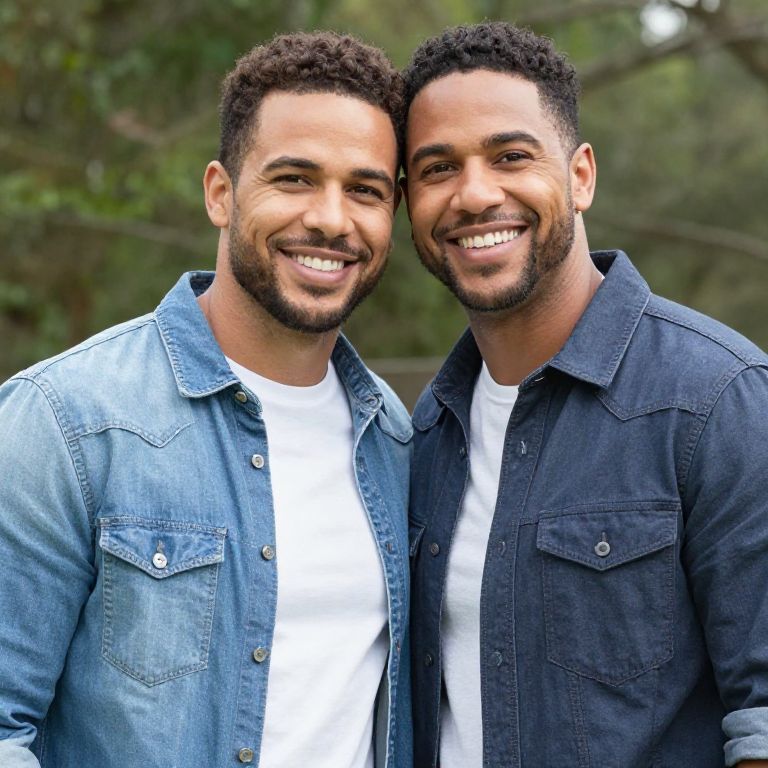 Photograph of two smiling, attractive young men standing close together outdoors. Both have short, curly black hair and trimmed beards. The man on the left wears a light blue denim shirt over a white t-shirt, while the man on the right wears a dark blue denim shirt over a white t-shirt. They have medium brown skin and are standing against a blurred green forest background. Their expressions are friendly and confident, and they both have white teeth visible in their broad smiles. The lighting is natural, highlighting their faces and casual attire.