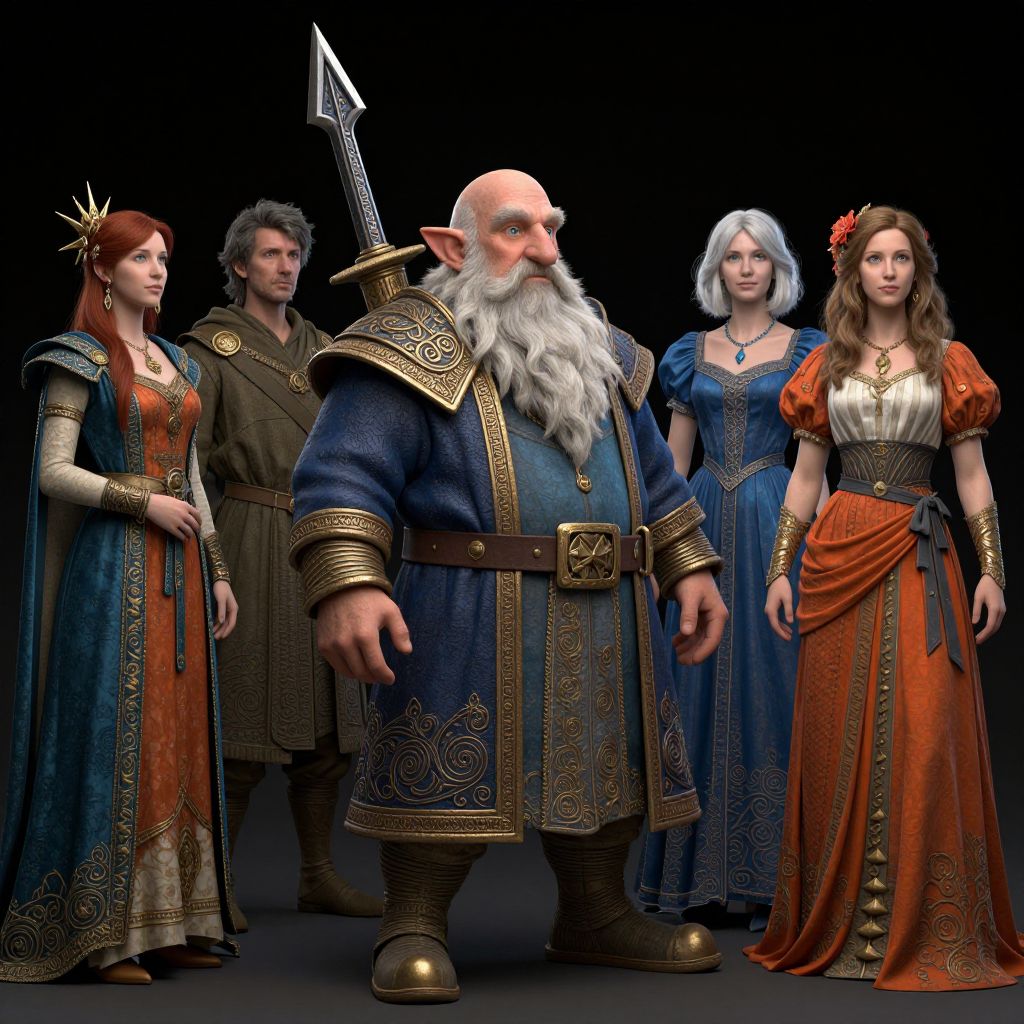 This is a CGI image depicting five fantasy characters standing against a black background. At the center is a tall, bald, older man with a white beard, wearing a blue, ornately embroidered tunic with gold trim, brown leather boots, and a belt with a large buckle. He holds a silver spear. To his left, a young woman with red hair wears a silver crown, a red and gold dress with intricate patterns, and silver arm guards. To his right, a young man with gray hair in a brown, medieval-style tunic stands. Next to him, a woman with white hair in a blue dress with gold accents stands. On the far right, a woman with brown hair wears an orange and gold dress with puffed sleeves and a red flower in her hair. The characters' expressions are neutral, and their clothing features detailed fantasy designs.