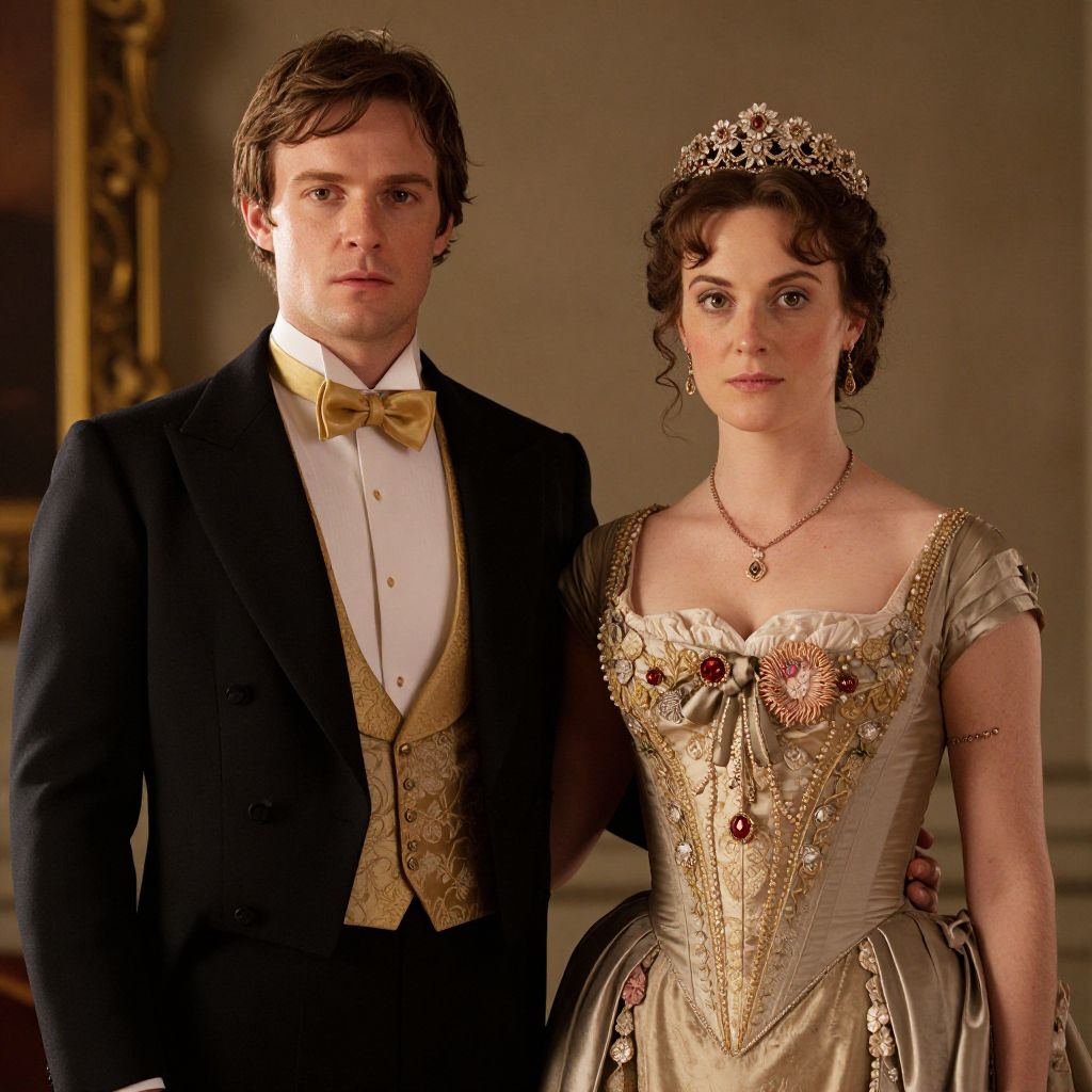 A regal couple dressed in opulent Edwardian attire, featuring a man in a black tuxedo with a gold bow tie and a woman in a beige corseted gown adorned with intricate embroidery and a delicate floral tiara, exudes a high-definition, cinematic elegance reminiscent of the Downton Abbey series, captured in a richly lit, vintage setting with dramatic golden-hour lighting.