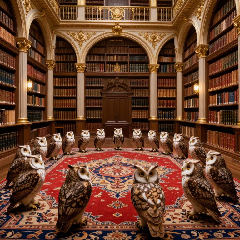 In a grand, opulent library adorned with ornate arches and golden accents, a parliament of owls gathers on a vibrant, patterned carpet, their solemn presence evoking a sense of ancient wisdom and mystery, as if each owl whispers the untold stories of forgotten gods amidst the endless rows of books.