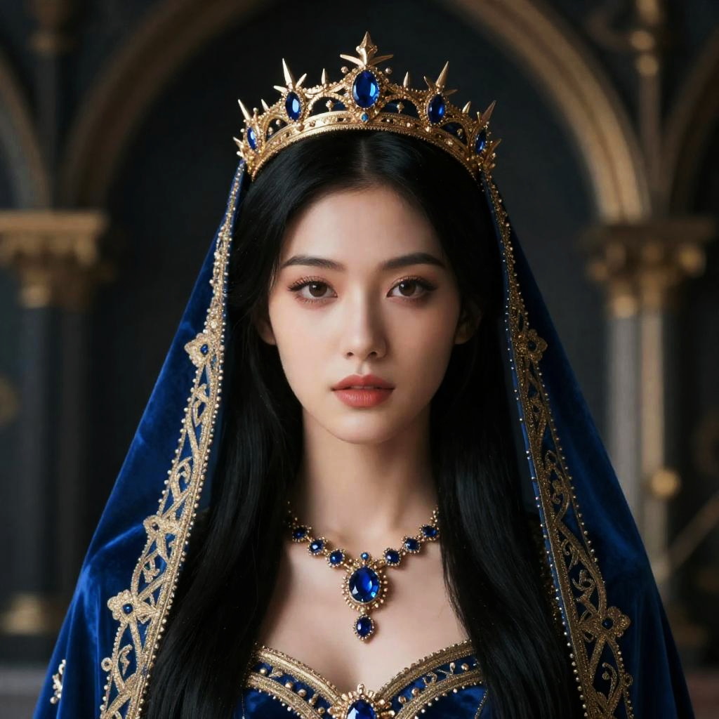 A regal woman with long black hair and fair skin sits confidently at a card table, wearing an elaborate red and white costume adorned with intricate lace and red diamond-shaped decorations. She wears a golden crown with red jewels, matching jewelry, and poses against a dramatic backdrop with playing cards floating in mid-air, creating a theatrical and fantasy-inspired atmosphere.