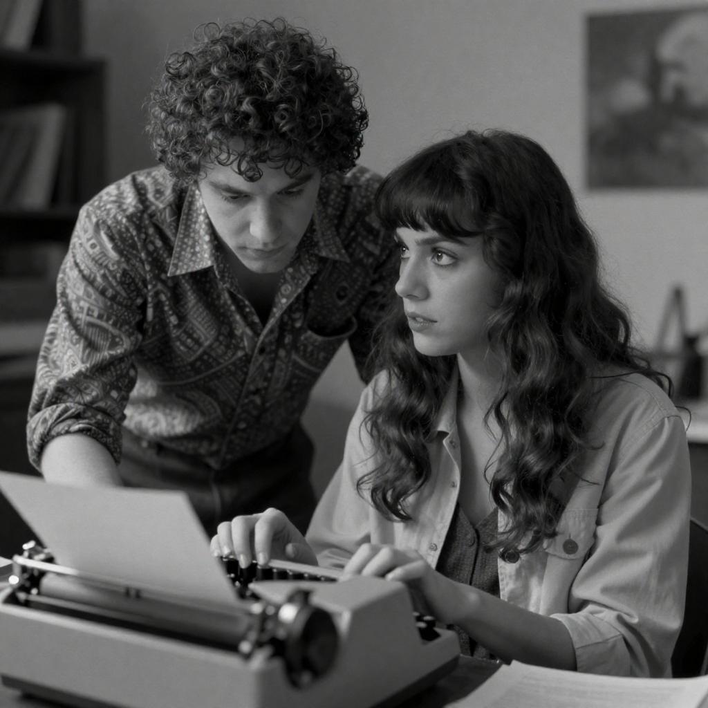 A man with dark curly hair wearing a brown coat and a woman with curly brown hair and glasses wearing a dark green shirt are focused on a vintage typewriter in a dimly lit workshop. The scene includes a gray vehicle in the background, highlighting a mix of old and modern elements.