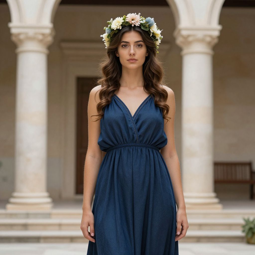 Photograph of a young woman with long, wavy brown hair, standing in front of a classical architectural background with white columns and a stone building. She wears a flowing, navy blue halter dress with a deep V-neck and a floral crown adorned with white and yellow flowers. Her expression is neutral, and she stands with her arms relaxed by her sides. The lighting is natural, highlighting the soft textures of her dress and the delicate flowers in her crown. The background is slightly blurred, focusing attention on her.