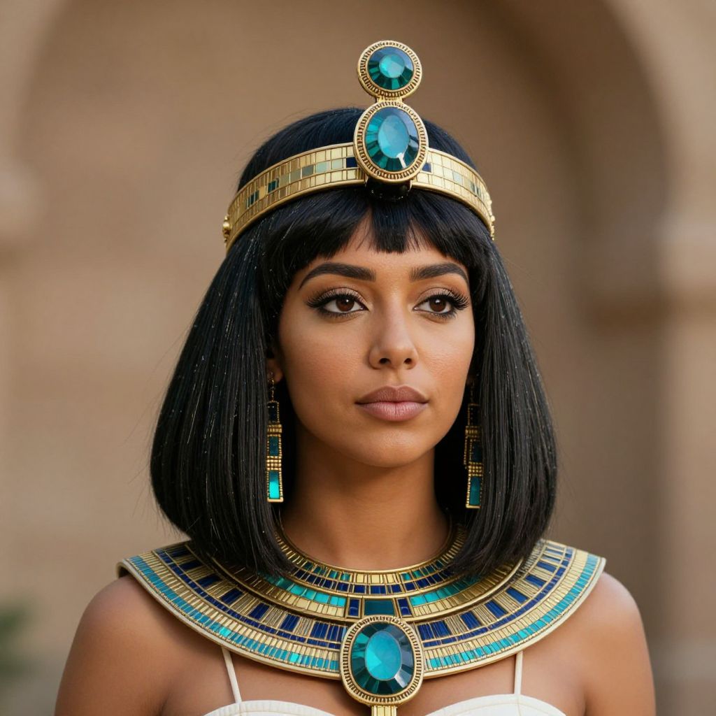Photorealistic digital portrait of a young woman with dark bob haircut, wearing ancient Egyptian-inspired gold and turquoise jewelry, including a headpiece and necklace,