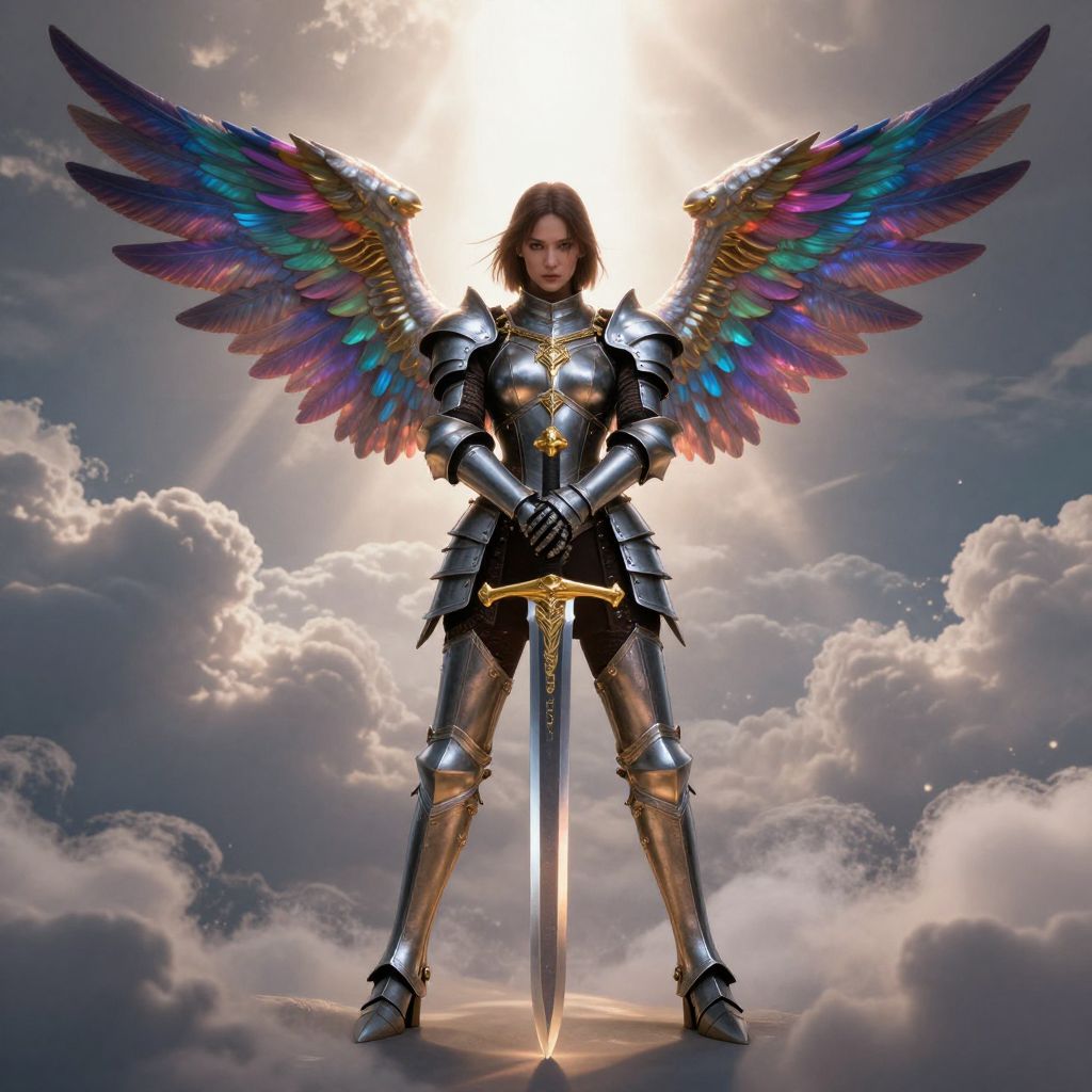 The image depicts a full-body concept art of a woman with chromatic wings, clad in medieval plate armor adorned with gold ornamental details. She wields a large sword, its blade gleaming with a subsurface scattering effect, and stands amidst volumetric light, casting a dramatic silhouette against a backdrop of clouds. The symmetrical arrangement of her wings and armor creates a balanced composition, while the clouds in the background add depth and a sense of scale to the scene. The overall composition is intricate, with careful attention to the interplay of colors, textures, and shapes, capturing the essence of a powerful, otherworldly figure.