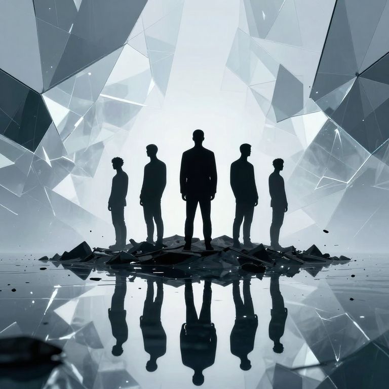 Silhouetted group of five people standing on a reflective surface against a shattered, geometric, bright white background. Digital art.