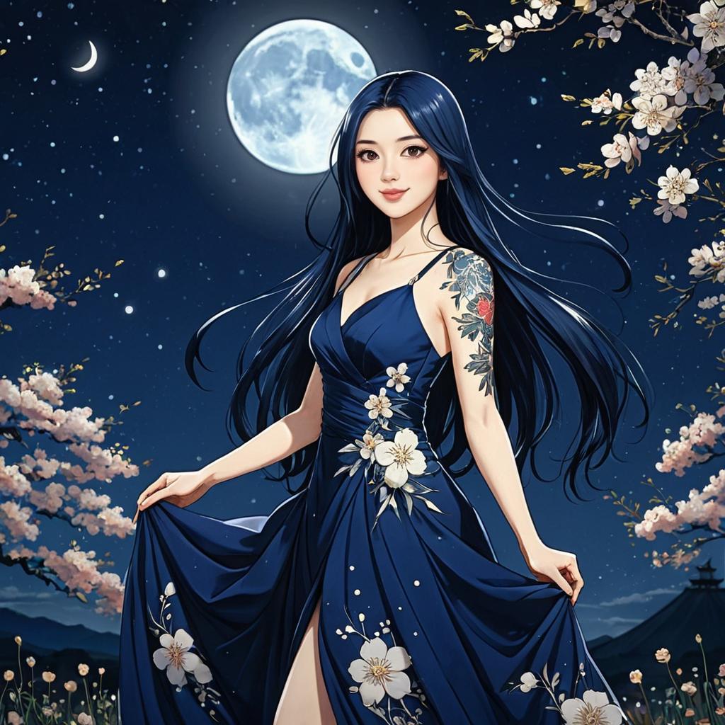 Anime-style illustration of a tall, slender girl with long dark blue hair wearing a detailed dark blue evening gown adorned with floral designs. She stands gracefully under a bright full moon and crescent moon in a night sky filled with stars. Cherry blossoms surround her, and a traditional Japanese pagoda is visible in the background, emphasizing the Japan setting. The girl has a floral tattoo on her upper arm and a gentle smile, creating a serene and elegant atmosphere.