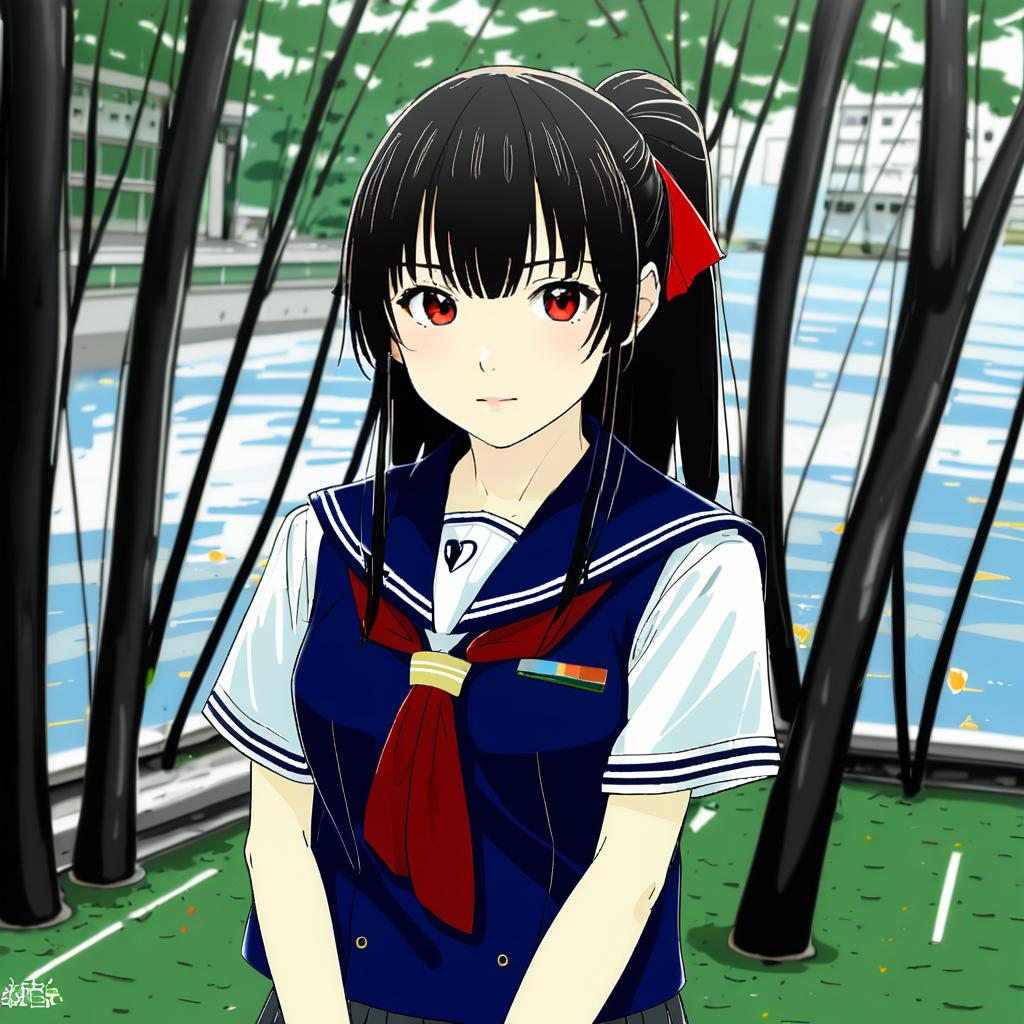 This digital anime-style illustration features a young girl with long black hair tied with a red ribbon, wearing a navy blue sailor uniform with a white shirt and red necktie. She has red eyes and a slight smile. The background shows a blurred outdoor setting with tall black trees and a blue water body, suggesting a park or riverside. The artist's signature "S-7" is in the bottom left corner. The girl's uniform includes a navy blue vest with white trim and a small yellow badge on the left side. The overall color palette is vibrant with a mix of dark and bright tones.