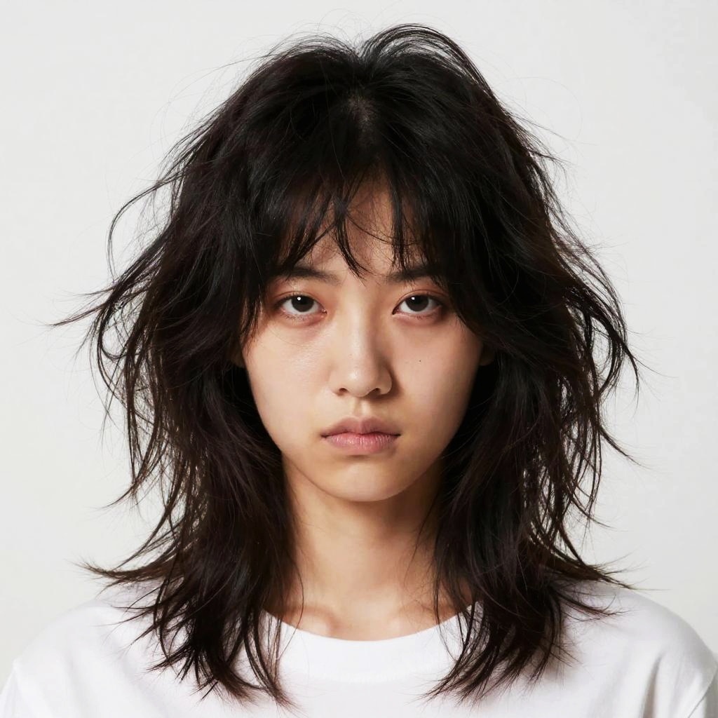 Photograph of an East Asian woman with medium-length, disheveled black hair and straight bangs covering her forehead. She has fair skin, dark brown eyes, and a neutral expression. She is wearing a plain white T-shirt. The background is completely white, making her the sole focus of the image. The lighting is even, highlighting her facial features and hair texture. The image has a realistic, high-contrast style with sharp details.
