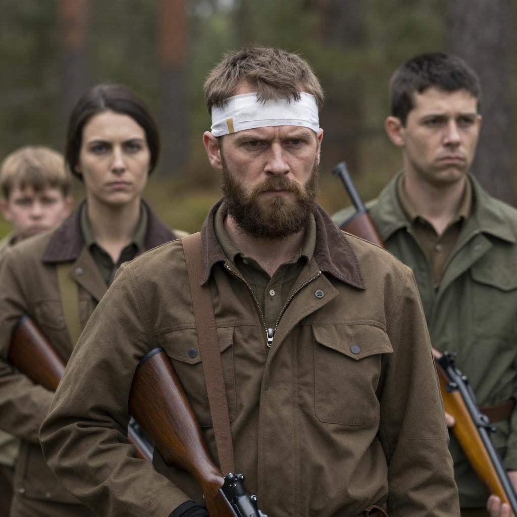 Photograph of a bearded man with short hair, sitting and holding a shotgun in each hand. He wears a blue vest over a light blue shirt and brown pants. Background features a large, faded poster of a woman's face and rope. The man has a serious expression. The image has a warm, sepia-toned color palette.