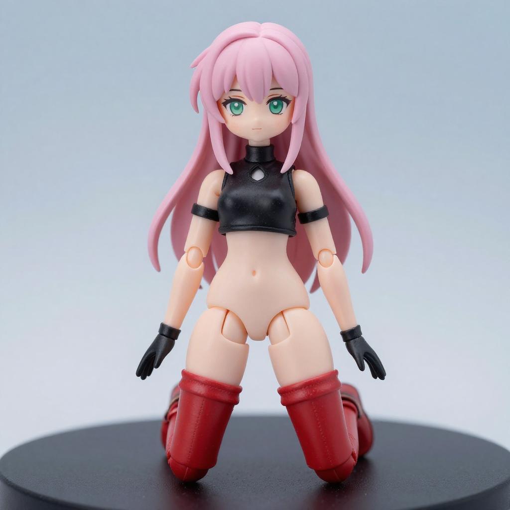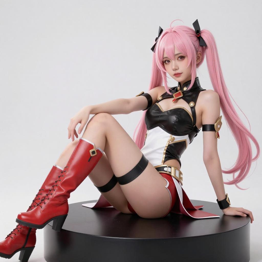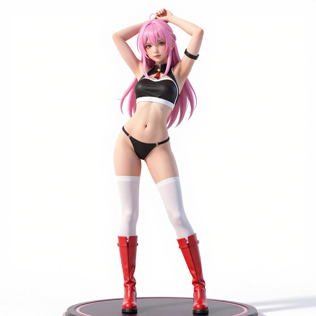 A digital anime-style figure of a pink-haired woman with long twin tails, wearing a black and white cropped top, black thong, white thigh-high socks, and red knee-high boots. She stands on a black circular platform, striking a dynamic pose with one arm raised and the other pointing downward. The background is a bright, gradient blue.
