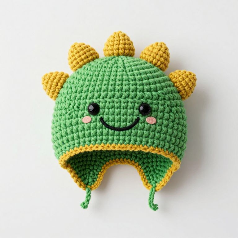 Crafted with vibrant green and mustard hues, this adorable baby dinosaur crochet hat features five textured spikes atop its head, a cheerful smile, and ear flaps trimmed in matching mustard, all designed by HatAndColdCrochet.
