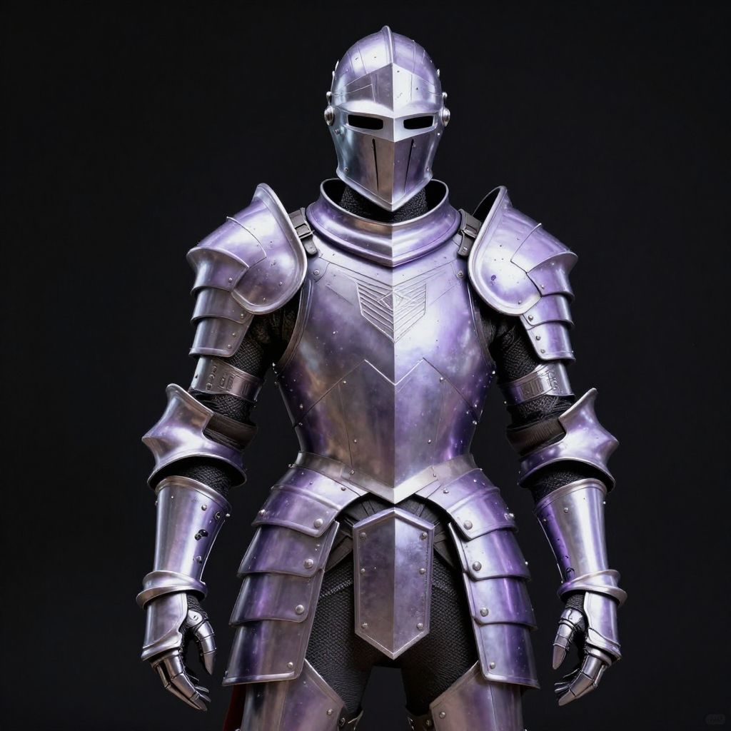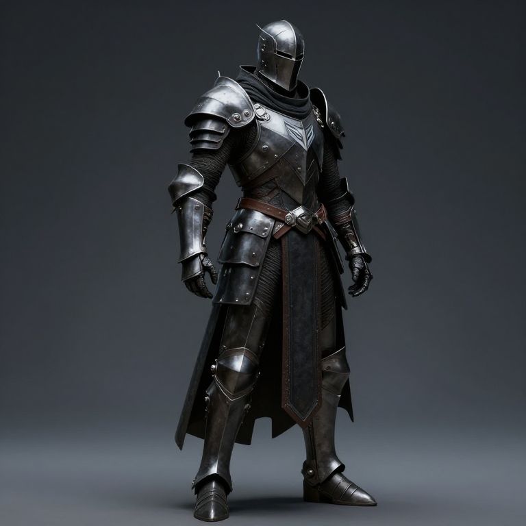 Photorealistic digital rendering of a tall, armored knight in shiny silver plate armor, helmet, long black cloak, and brown belt, standing against a