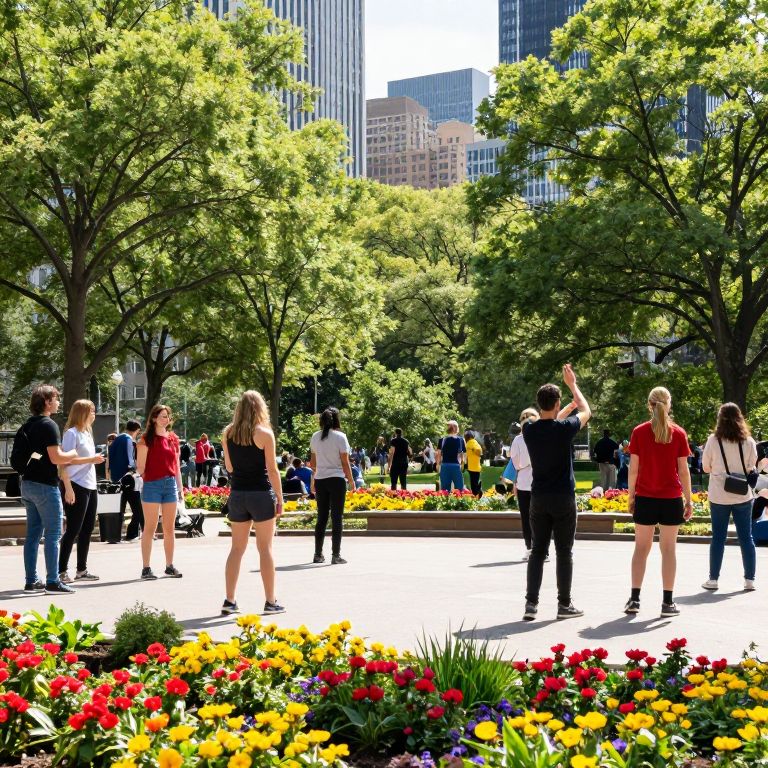 People lounging on vibrant blankets amidst lush green grass in London's St James' Park, with a backdrop of towering skyscrapers and a canopy of leafy trees.