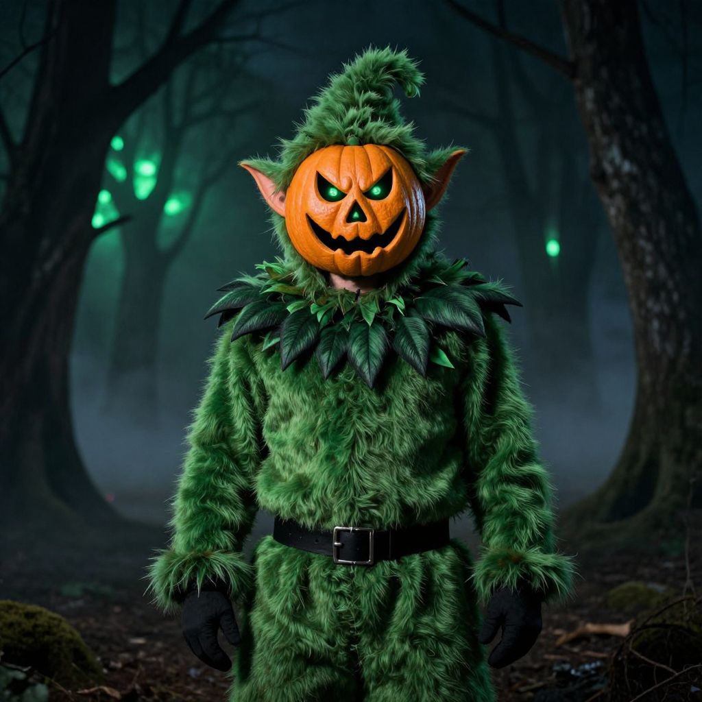 Photograph of a creepy, tattered zombie with a glowing, carved jack-o'-lantern head, standing in a foggy, haunted forest with