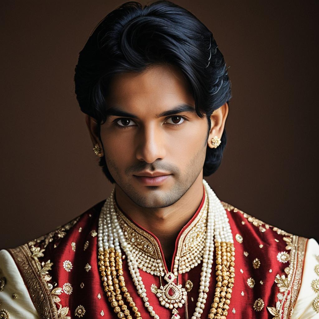 Indian wedding outfit groom,solo, 1boy, male focus, realistic, jewelry, looking at viewer, necklace, black hair, upper body