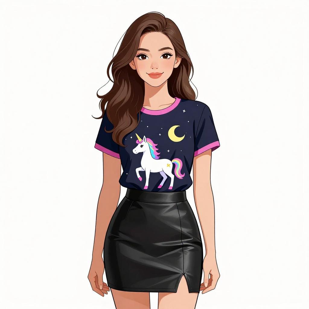 Woman with pretty face and pretty hair. smiling Woman, casual fantasy, graphic t-shirt in dark color with short sleeves and contrast trim on the neck and sleeves, unicorn and moon print on the front, faux leather mini skater skirt in black, white background. --sref 1467