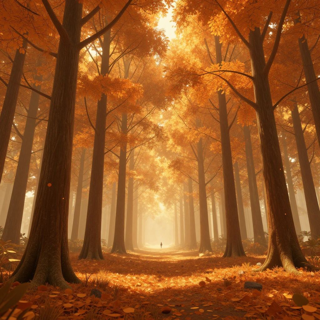 A serene 3D-rendered pathway flanked by towering, golden-hued trees creates an ethereal forested corridor, evoking a dreamlike, high-definition digital art scene where nature and architecture converge in perfect symmetry.