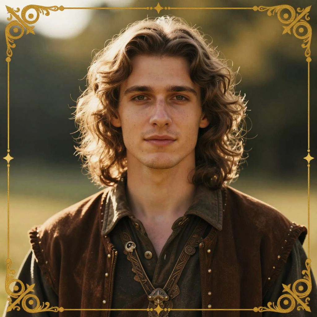 Realistic photo.A detailed painting of a wandering bard in a brown leather vest with messy blonde hair and a lute slung over his shoulder, standing in front of a full moon. Inspired by the Romantic era, the scene has a dark background that enhances the rich colors and fine details of the character. The composition exudes a moody, atmospheric quality, combining classic beauty with a mysterious, nocturnal ambiance. realistic photo