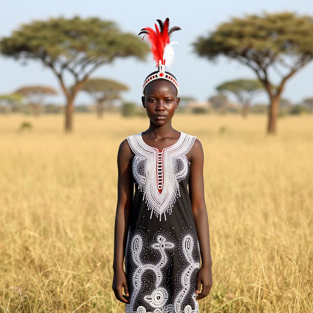 Photograph of a young African woman standing in a sunlit, open savannah with tall, dry grass and blurred acacia trees in the background. She has a dark brown skin tone and wears a traditional black dress adorned with intricate white beadwork. Her head is decorated with a tall, red and white feathered headdress. Her expression is serious and she looks directly at the camera.