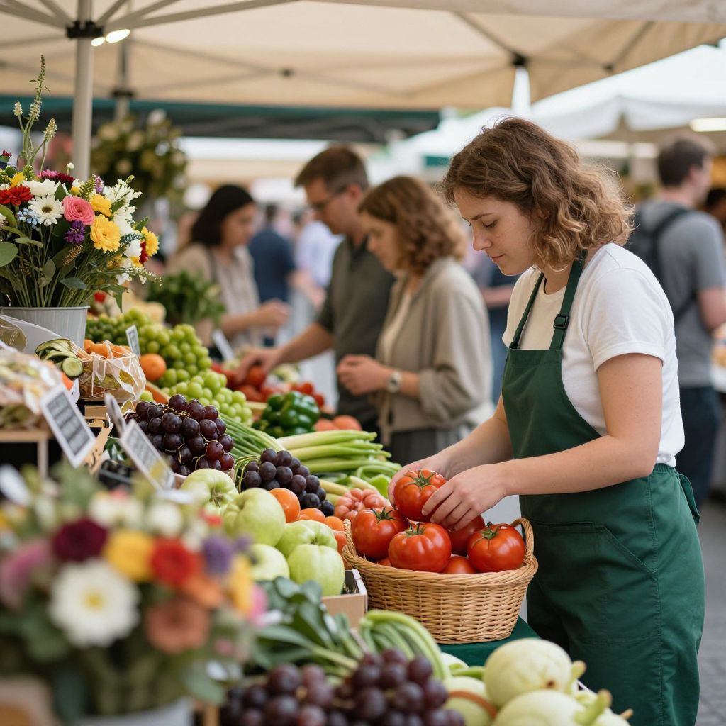 Photograph of a bustling outdoor market. A young woman with wavy brown hair, wearing a white shirt and green apron, stands at a vibrant vegetable stall, sorting red tomatoes into a wicker basket. The stall is filled with an array of colorful vegetables, including green bell peppers, yellow squash, and dark purple grapes. In the background, several blurred customers, including a man and a woman with curly brown hair, browse the market. The scene is under a large white canopy, with soft, natural light filtering through. Bright, multicolored flowers in a vase are visible on the left side of the stall.