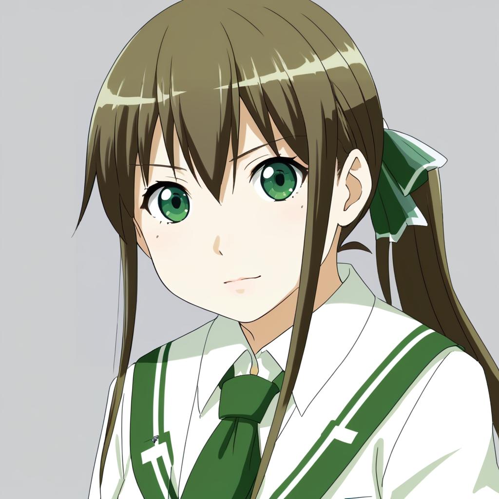 Close-up anime illustration of a young girl with long brown hair tied in a ponytail with a green ribbon. She has bright green eyes, a mole under her eye, and is wearing a white school uniform with green accents and a green tie. The image features a clean, simple gray background.