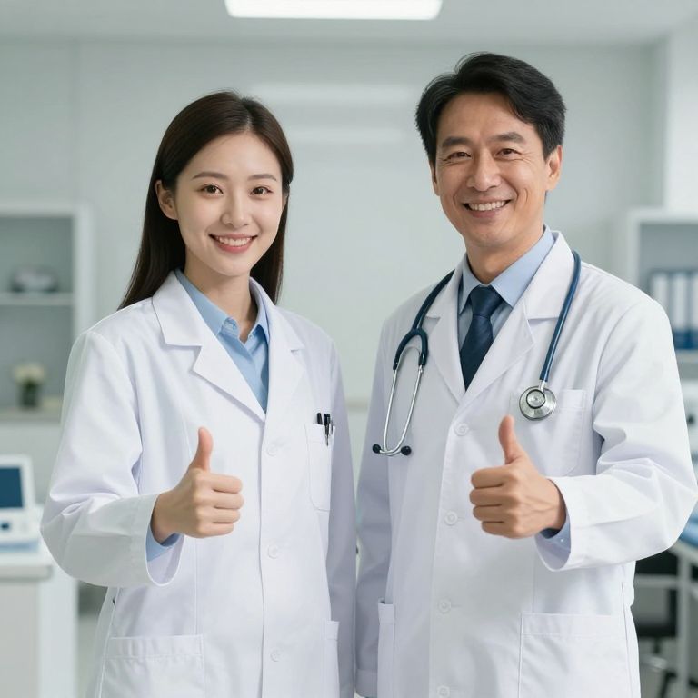 Photograph of a smiling Asian male and female doctor standing side by side in a bright, modern medical office. Both wear white lab coats; the man has a stethoscope around his neck, while the woman has a pen in her coat pocket. They both give thumbs-up gestures. The woman has long black hair and light skin, while the man has short black hair and slightly tanned skin. The background is blurred, featuring white shelves and medical equipment. The lighting is bright and even, enhancing the clean, professional atmosphere.