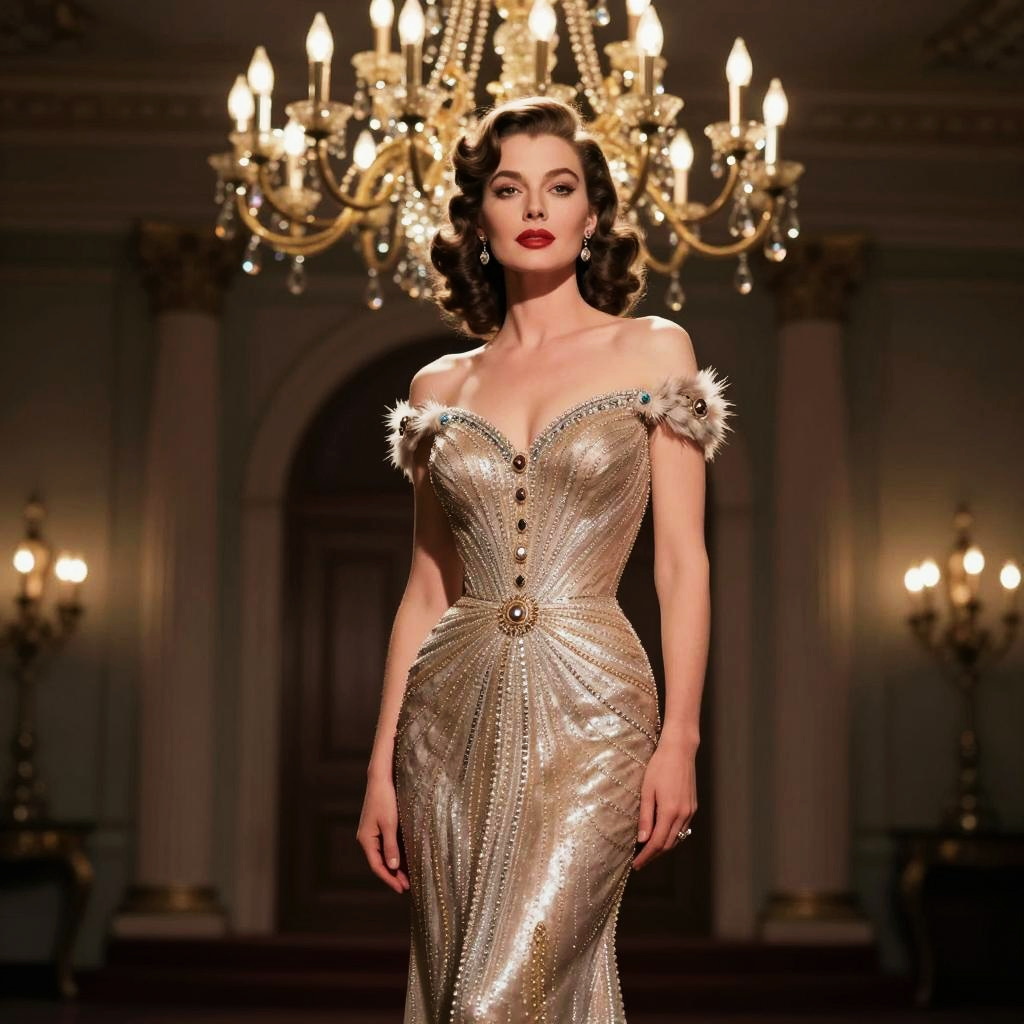 A woman confidently poses in a stylish, metallic blue dress, reflecting a modern and chic fashion sense. The setting and outfit add a cinematic feel, suggesting a connection to classic or contemporary films.