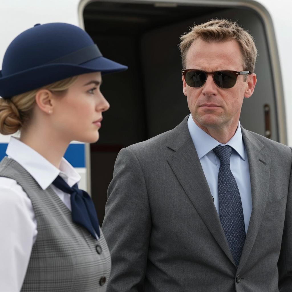 Photograph of a serious-looking man wearing dark sunglasses, a gray suit, light blue shirt, and patterned tie standing next to a woman with blonde hair in a low bun, wearing a navy blue hat, white shirt, and plaid vest. The woman is in profile with a neutral expression. They are positioned near the open door of an airplane, suggesting a professional or travel-related context.