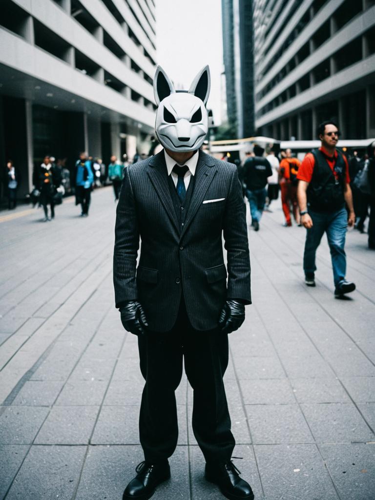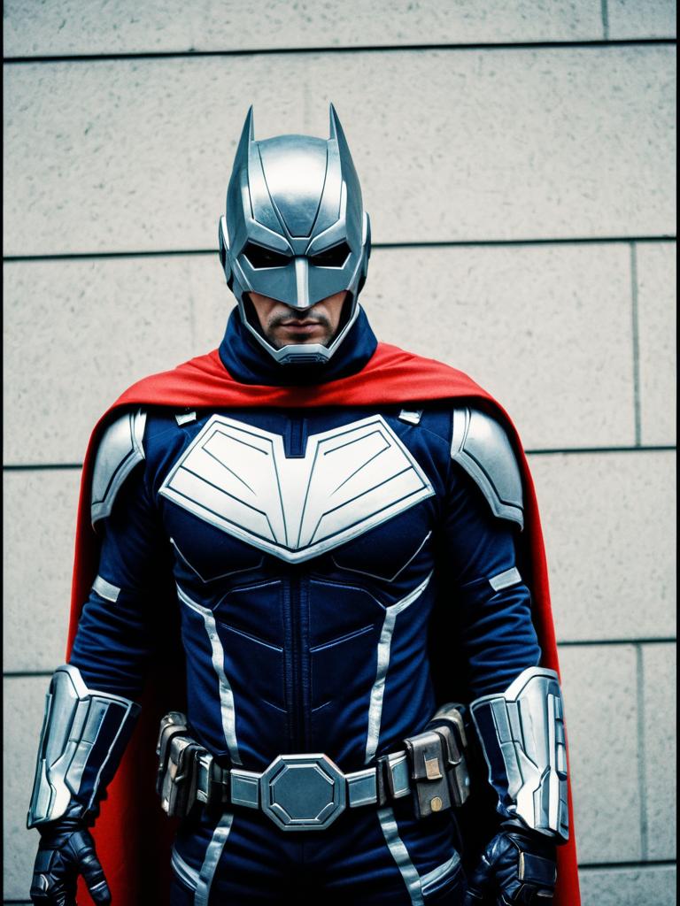 Adult man dressed in a detailed Dag cosplay costume featuring a blue suit with red accents, black gloves, shoulder armor, and a stylized helmet with pointed, horn-like extensions. The image is taken in an urban outdoor setting with blurred pedestrians and tall buildings in the background.