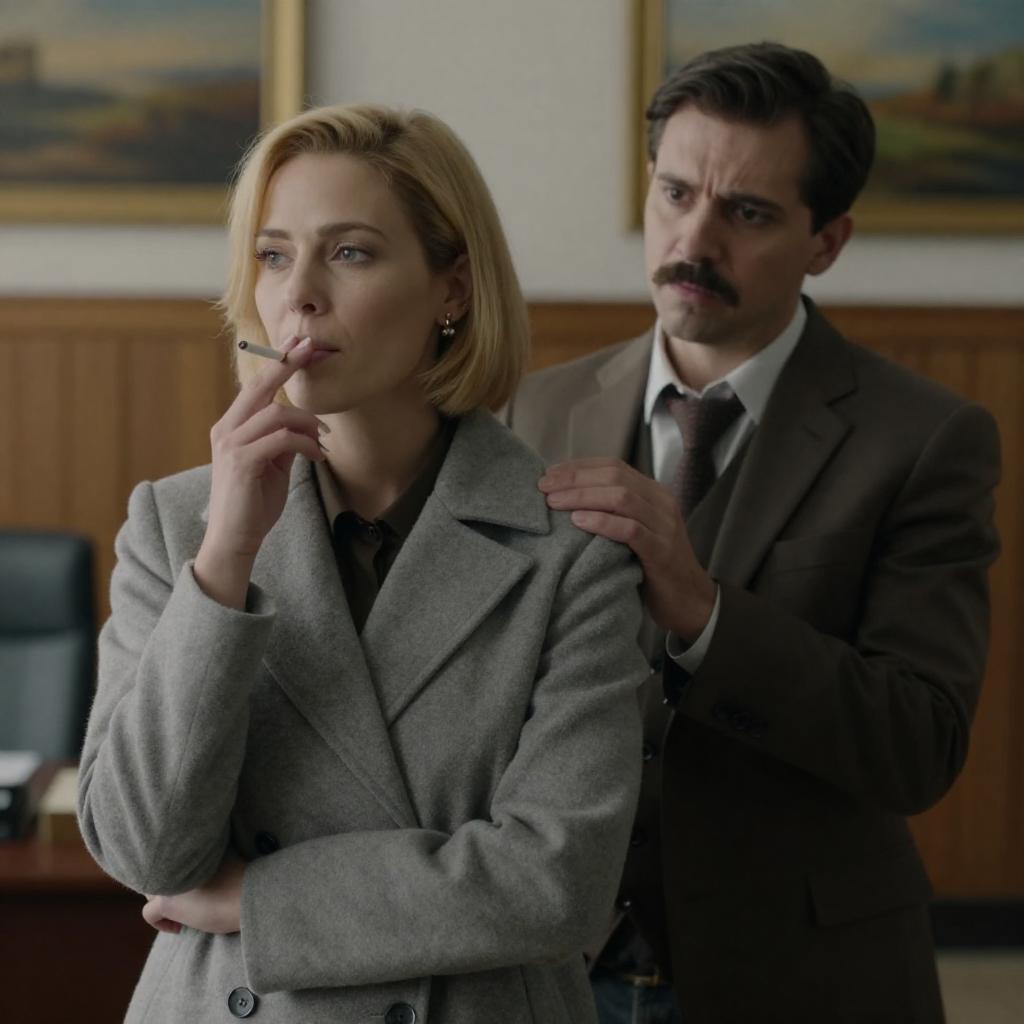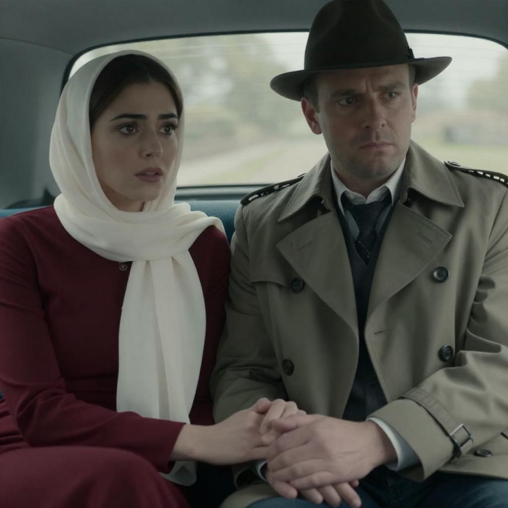 Photograph of three men and one woman inside a car. Three men with dark, formal clothing, mustaches, and serious expressions. Woman on right wears brown coat and beret, looking forward. Car interior with greenish light outside. Three men on left, woman on right. Dim lighting.