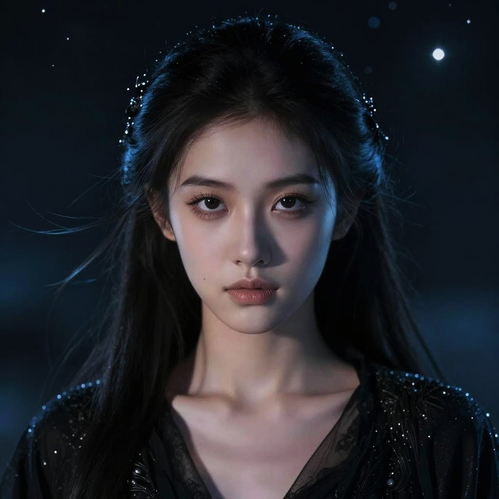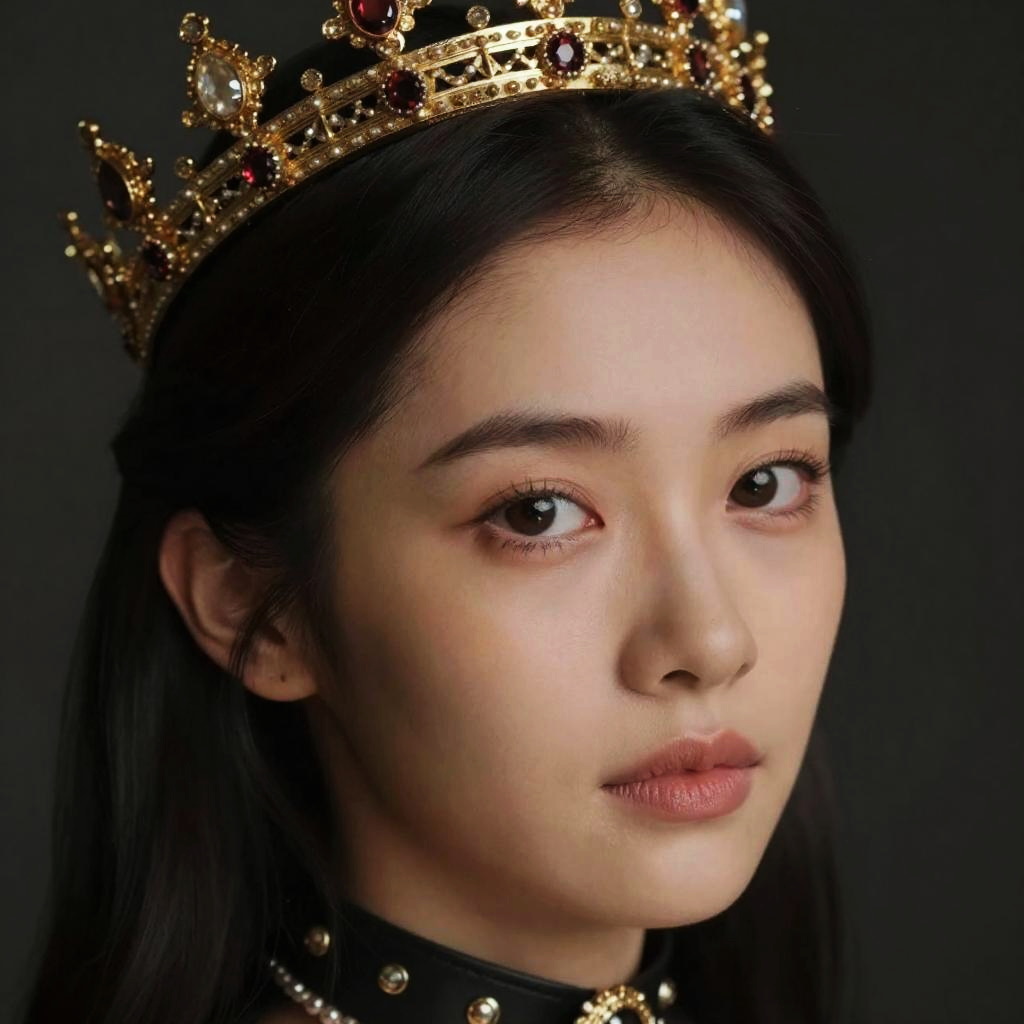 Portrait of a young East Asian woman with long dark hair wearing an ornate metallic bone armor and a golden crown with red jewels. The image uses dramatic lighting and shadow to enhance the photorealistic and detailed textures of her armor and skin, highlighting her delicate facial features and regal expression.