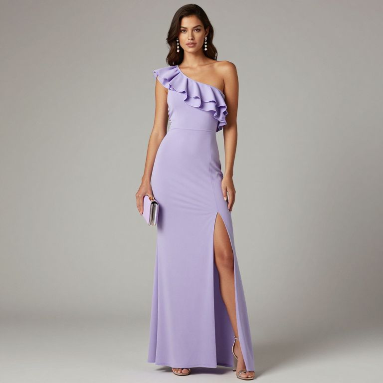 Photograph of a young woman with long, wavy dark brown hair, wearing a light lavender, one-shoulder evening gown with ruffled detailing on the bodice and a high slit on the left side, revealing her left leg. She holds a small, white clutch in her left hand. She has a fair complexion, is standing against a plain, light gray background, and wears silver drop earrings and matching high-heeled sandals. Her pose is elegant, with her right arm relaxed by her side and a confident expression on her face. The gown's fabric appears smooth and slightly shiny.