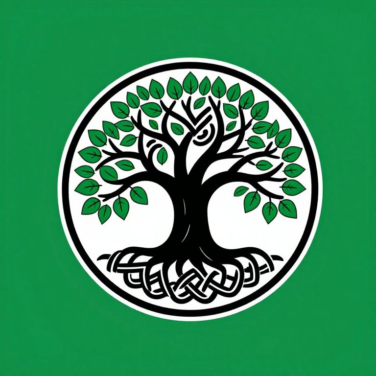 The image features a striking logo in a circle format, depicting a Tree of Life with a bold, modern style. The tree, with its intricate Celtic knot roots and branches, is balanced and symmetrical, creating a sense of harmony. The roots, intertwined in a complex pattern, spiral outward, meeting at the base of the tree. The branches extend upwards, adorned with green leaves that add a touch of nature to the design. The entire illustration is set against a clean, flat emerald background, which enhances the visual impact of the tree and its roots. The overall composition is balanced and well-proportioned, with the tree centrally positioned within the circle, creating a sense of unity and completeness. The use of bold lines and flat colors gives the logo a contemporary feel, while the Celtic knot elements add a touch of tradition and mystique.