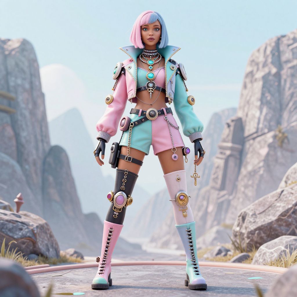 Digital art of a futuristic, anime-style woman with pastel pink and blue outfit, adorned with jewelry and accessories, standing confidently in a rocky landscape.